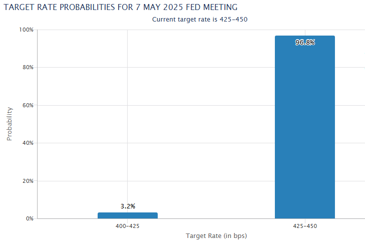 Ok this week we have $42Bn in new US Govt 10yrs begin auctioned off today and $25Bn 30s on Thursday. We also have a congressional testimony from Secretary Bessent in front of congress tomorrow alongside the FOMC decision. The FOMC is widely expected to keep rates unchanged. Here is the CME Fedwatch tool showing a 96.8% confidence of unchanged: