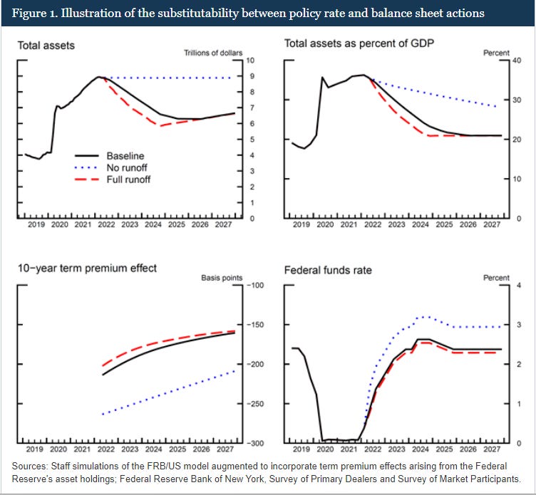 “The model implies that a one-time permanent reduction in the Federal Reserve's holdings of 10-year equivalent Treasury securities equal to 1 percent of nominal GDP raises the term premium on a 10-year Treasury security by about 10 basis points, all else equal.” Federal Reserve June 2022