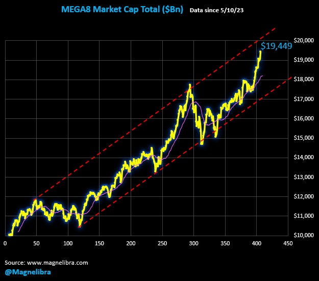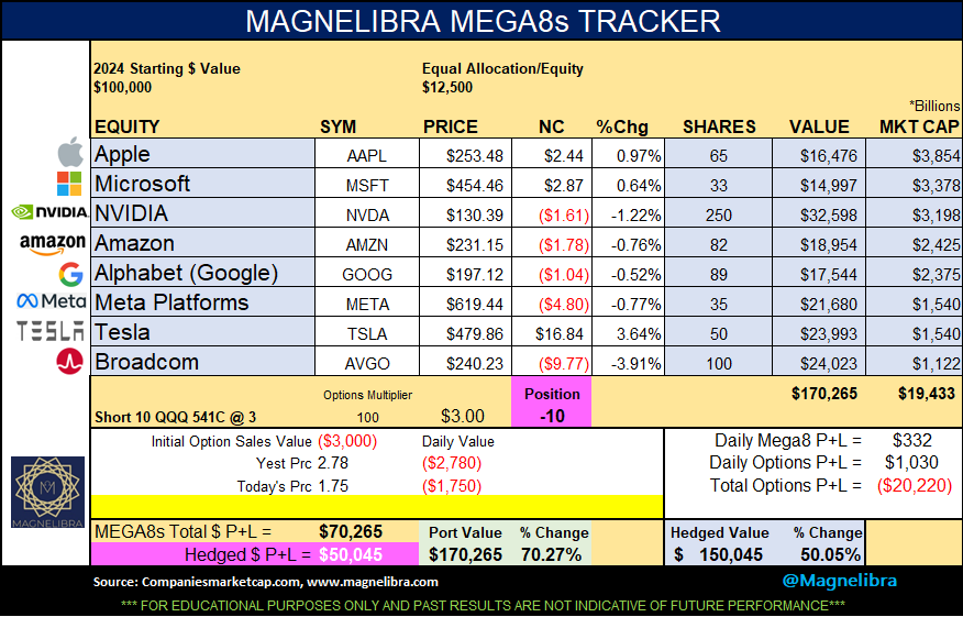 Ok let’s flip over to MEGA8s and take a look at our data there, Tesla continues to outperform as retail post election is all in and we see BroadCom saw some profit taking. This weeks hedge continues to perform well: