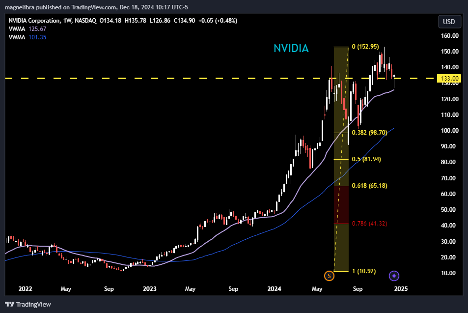 This is a very simplistic approach, but its something that you could use as a base case for your trading or even your long only equity investing. Anyway as far as the Nasdaq, we have seen liquidations out of some of those MEGA8s, in fact when we look at Nvidia, well let’s just say, its flashing a major red signal and a few podcasts back we talked about buying a cheap put spread, which is now working out. We have seen a close move toward the 21wk MA, which today has caused a technical bounce, but we believe that the $133 area is our line in the sand for the weekly close, so keep an eye out on this one: