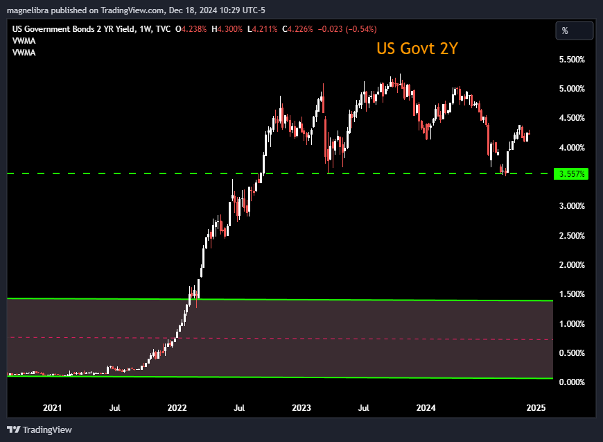 As far as the rates outlook, we continue to believe the FOMC will cut the Fed Funds below 3% next year and probably end at about 2.5%. We site deteriorating global economic demand, coupled with geopolitical unrest and a potential for the start of a major global risk sell off that is far long overdue. When we look at the US govt 2Y yield chart, you can just see a major decadal top forming and a break below 3.56% will solidify that for us:
