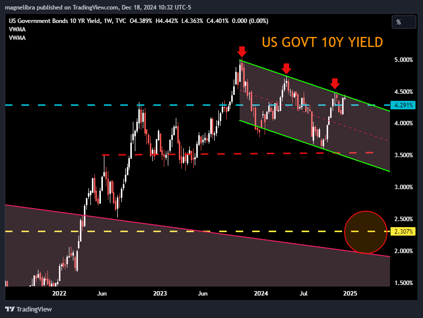 We can also see that 2024 has kept the US Govt 10Y in a nice trading band where 4.29% now on the weekly will close below our line in the sand there, currently the 10yr yield is 4.40% but this is still below our trend channel for now: