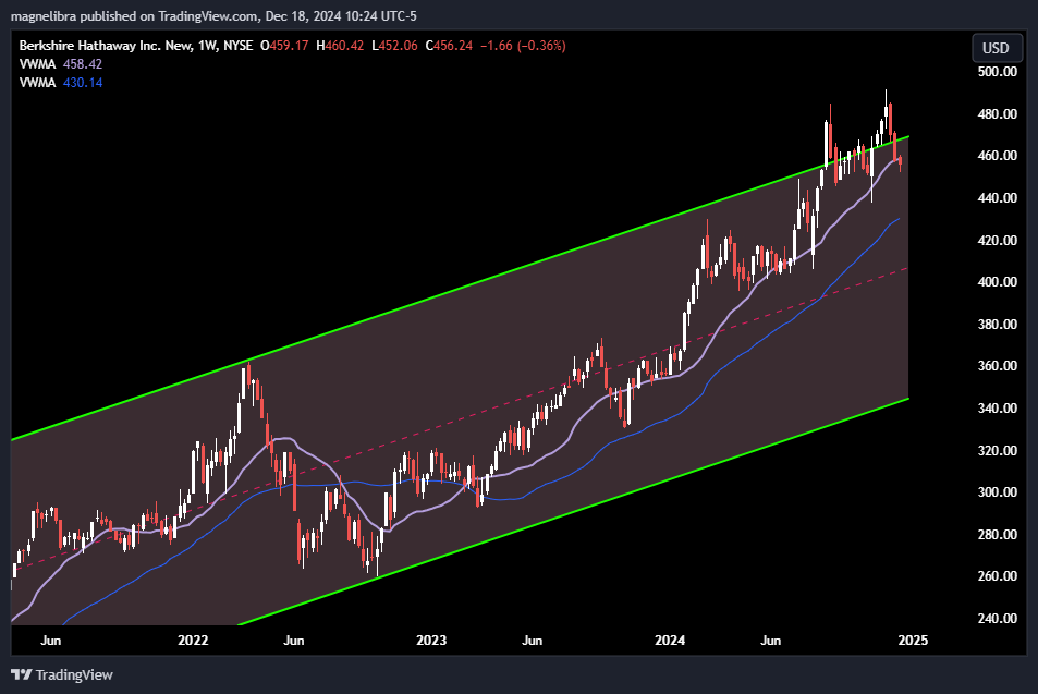 We see topping formations and or selling in the other techs as well, META, NFLX but we want to look at Berkshire. We know Buffett has been accumulating a lot of cash lately, > $330Bn and after a few attempts to break out of this long trend channel, its about to close below the 21wkMA for the first time since June: