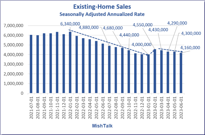 With a near certainty of a 25bp hike baked in, (boy we hope JPowell does Nada) the markets have pared back some recent trend moves. The Nasdaq is well off some 400 points or so from its highs, and the US fixed income markets have given up some recent gains via a bear flattening move over the last week. With the market so certain of a 25bp hike, we won’t go against the tide, but what an Ace move it would be if the FOMC did not hike. We aren’t even sure why they would hike given the recent collapse in inflation data. Yea, yea we keep hearing housing is still elevated, but is it? Mishtalk.com posted this chart: