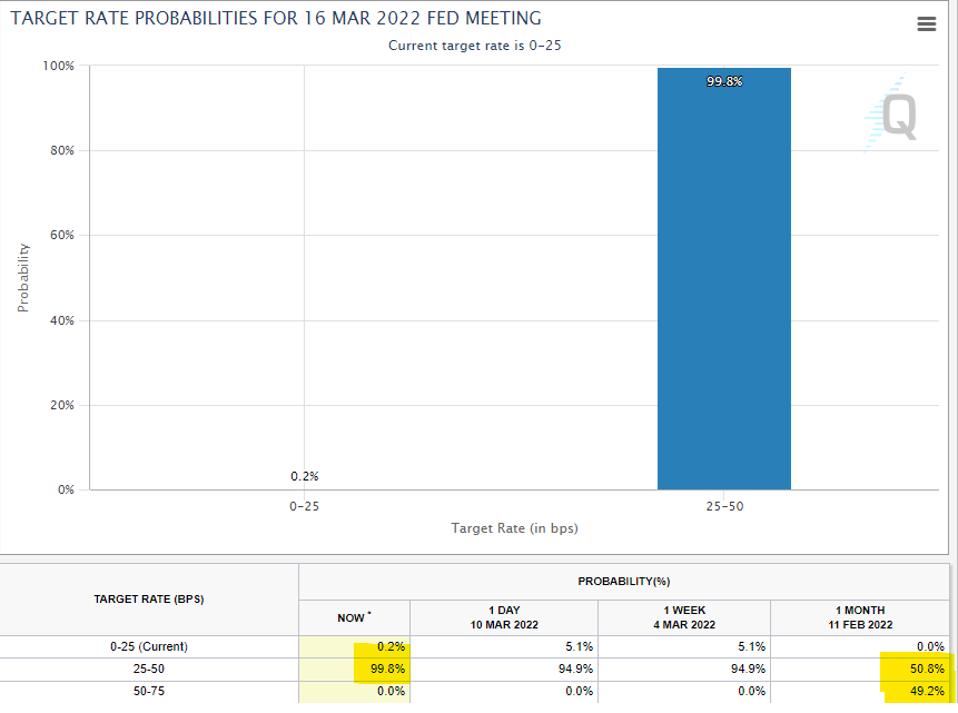 The FOMC meeting is this week and the market expectations are for a garden variety 25bps hike. Although we view this as a major mistake on the FEDs part because we don’t believe the Ukraine/Russian conflict should intervene in the overall inflation issue that the FED is meagerly trying combating. In fact as you can see from this CME watch tool, the market a month ago was split between the 25bp/50bp call:
