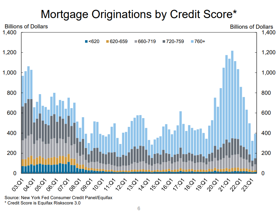 We also wanted to share this chart from the quarterly NY FED banking report. What it tells us is that housing prices can remain elevated despite the massive increase in rates. This is because the majority of the loans post covid went to high quality score borrowers who most likely not only locked in their own residence but bought investment properties with ultra low rates as well. So this would suggest the higher rates will not dampen pricing as many believe because the supply of homes will remain low and duration of the mortgages are now extended and locked in sterilized by the higher rates (meaning no incentive to liquidate or refi). This is important and the FRB will most likely be looking at this to suggest it can stay higher for longer: