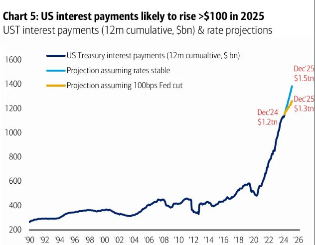 Speaking of interest rate costs, and as this chart points out, you can see that if the FOMC cuts rates, this directly reduces the total interest costs directly.