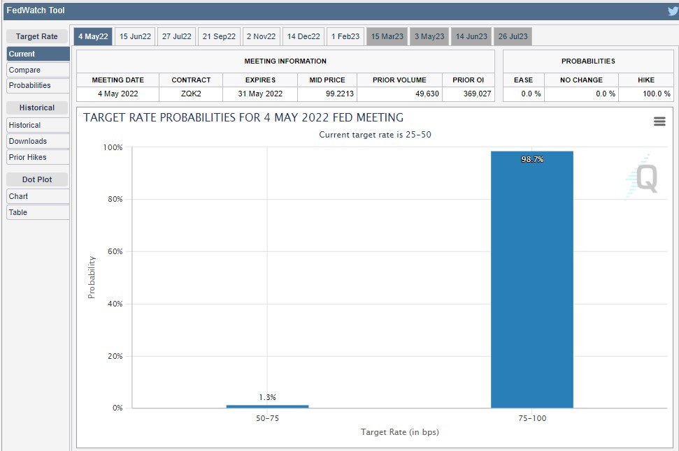 With the FOMC meeting this week its not surprising that we are seeing a little bit of Friday’s selling reversed here today. We have seen this time and time again, the equities rally into and after the FOMC decision. Does it matter they are raising 50bp as denoted by the CME watch tool…umm, no it doesn’t.