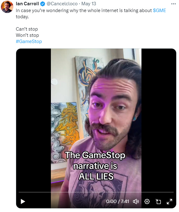 Another account you guys should follow is @Cancelcloco on X he does a lot of great research into subjects that many won’t explore on their own in regards to the who what and where behind a lot of things in our system. I don’t always agree with things but the research is in depth and informative. Here is a link if you have X to watch his post on GameStop the other day IanCarroll@Cancelcloco on GameStop