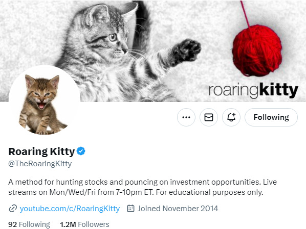 Ok so just wanted to add a few things today on the recent developments involved in GameStop. As a sidenote, if you haven’t seen the movie Dumb Money, it does a pretty good job of outlining the nuts and bolts of the move GameStop had in 2021. It is on Netflix if you have it and I would recommend watching it. Anyway GameStop stock is at it again but first the X profile on RoaringKitty the man behind the move and the main character in the movie: