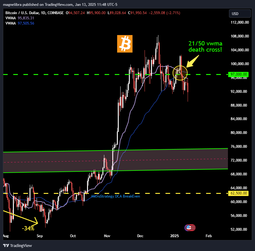 With the equity markets topping out, we suspect Bitcoin will follow all asset markets down as well, here is the current chart and you guys know our sell level indicator was a close below $97k on the weekly backed up by the 21/50 dVWMA cross: