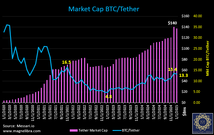 Assuming Tether doesn’t burn or reduce their total market cap by any significant amount, if this factor chart returns back to a 5.0x spread, then the Bitcoin price is right around $35,000 for that and from its current $92,000 that is a loss of 62%! Saylor’s position would be down about $12.3Bn unrealized!