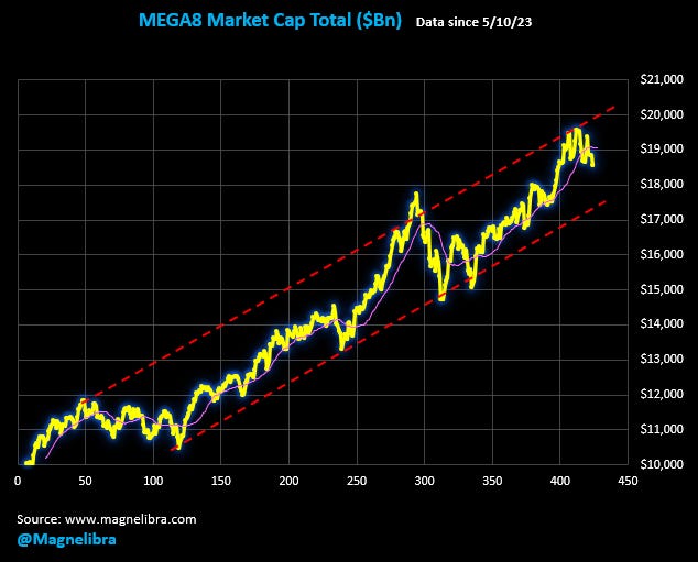 As far as the MEGA8 market cap total chart it has rolled over and the bottom of the trend channel seems to be first logical support: