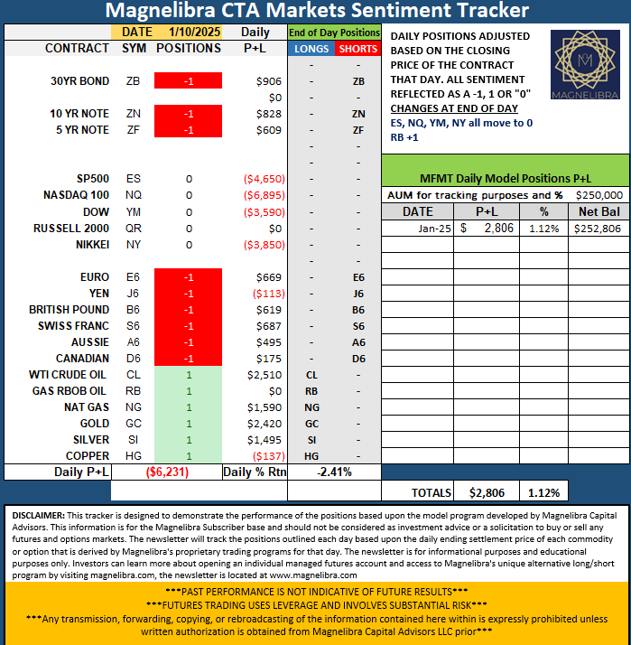 As far as the Magnelibra CTA market sentiment tracker, the entire equity markets have moved to a neutral “0” positioning with RBOB now a +1.