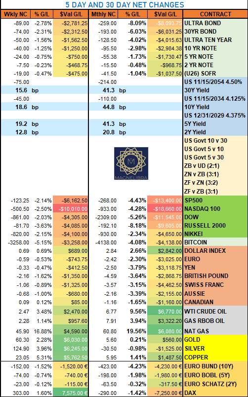 As far as the rolling changes Nat Gas the % winner and Bitcoin % loser on the 5 day and 30 day wise Nat Gas the standout and Russel2k and Ultra Bond the big losers: