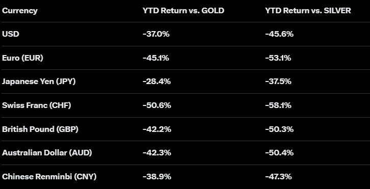 YTD gains stand at approximately 56%, driven by safe haven demand, central bank purchases, and a weakening U.S. dollar but honestly all the fiats are being heavily discounted.