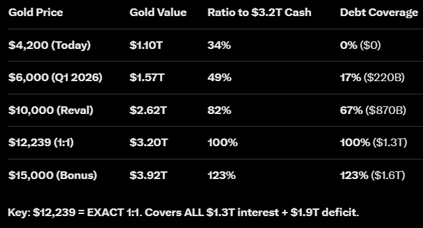 Now if full revaluation is in the future, how high can gold go? Well many Magnelibra readers know we look at the coverage ratio of US Treasury gold holdings vs actual physical cash in the system, at a minimum we would suspect a 50% cash coverage ratio which is right around a $6k gold price, but maybe the US treasury is looking for 100% coverage, and that comes in at $12.2k Gold per Oz: