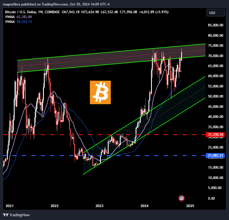 With volatility in mind and all eyes on Bitcoin trying to make new ATHs, we can’t help but think it too is setting up for a big move one way or the other. Its still stuck in the upper range area we have outlined for quite some time:
