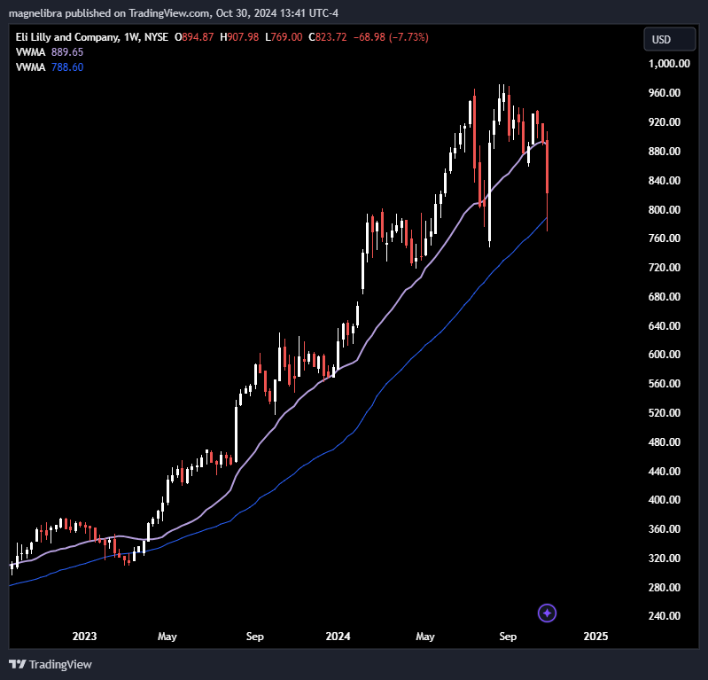 LLY down 7.7% and running into its 50p weekly VWMA: