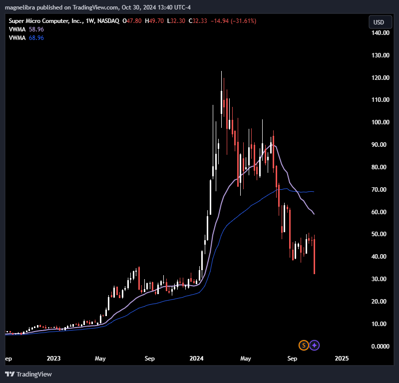 In other news Super Micro Computer (SMCI) was hit hard today (-31%) on news of EY its auditor has resigned. Also Eli Lilly (LLY) was hammered as their fat loss drug euphoria has seemed to have run its course, both stocks down hard today: