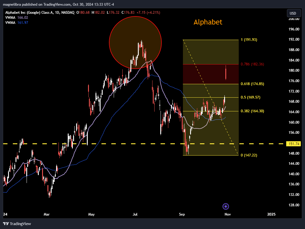 The stock was up decent after the close yesterday and in early trade today topping out at $183.79 today (GOOG) +7% and when we look at (GOOGL) technically we love this set up today. Technically it has reached a significant reversal area and no doubt will see sellers show up here. We suspect a rejection from this level and a close below $175 on the weekly will see follow thru on to the downside: