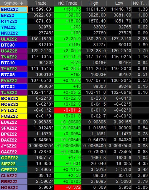 We have rarely seen a day that starts all green on our boards end up all green by the end of the day, will today be different? What has generally occurred is that the mornings euphoria fades and by the end of the day sellers used higher prices to reset shorts. We aren’t sure if today’s rally across pretty much all of the complexes we follow will last, but its a new month, FOMC is here and it seems some have taken this opportunity for wishful “pivot” thinking. Here is a current snapshot of the markets we follow: