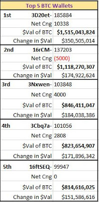 As for the top 5 BTC wallets, the chart to the left shows that 4 wallets have now surpassed the 100k BTC mark. The top 2 wallets continue to hold above the $1 Billion-mark dollar valuation, especially given this weeks move. It will be interesting to see if new wallets start to accumulate BTC and enter these lofty #Hodling levels.