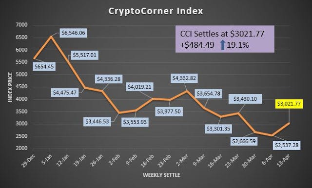 As for our CryptoCorner Index it settled at $3021.77 up 484.49 or 19.1% on the week. This was a constructive settlement but we only expect a sideways to higher consolidation at this point, but fundamentals are improving alongside the technical picture. Here is the chart of the index: