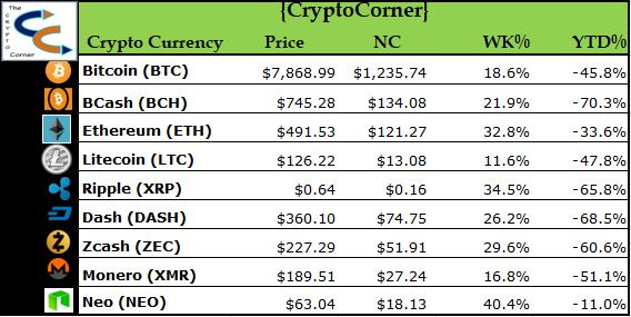 Neo was the big winner on the week up 40%, followed closely Ripple and Ethereum up 34.5% and 32.8% respectively. Bitcoin flirted with the formidable $8k area and as of this week is now above and hovering around $8100. For the bulls this was a much-needed reprieve from what seemed to be constant and sustained week after week selling. However, we felt technically Bitcoin if it continued to reject pushes below the $6300/6500 area, that upside pushes were possible. We aren’t in full bull mode, but further sideways consolidation may be leaning toward a greater chance for a push back up.