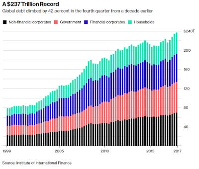 One thing people aren’t thinking of however is the fact that the global fiat currency system could be called into question. What we mean is that the debt just keeps piling up and for those readers who may not know, our current monetary system is all just debt, money and debt are different sides of the same coin. One cannot exist without the other, not anymore at least, but Bitcoin and cryptocurrencies could change that. When we look at the global debt pile, the numbers are truly staggering, so perhaps these prognosticators, may eventually be proven correct, just not for the reasons they may be thinking. Anyway, here is the global debt chart for your viewing pleasure, just to put into context how large this problem has become, its up a staggering 42% from just a decade ago. As fundamental economic Austrian followers, there is one word that encapsulates this situation rather succinctly it’s #UNSUSTAINABLE: