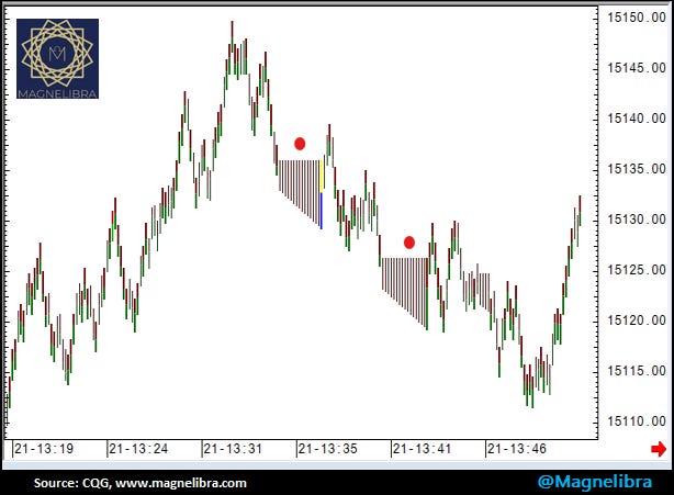 We saw a decent HFT sell program come in at 1:35pm CST today. This seller put a lid on the Nasdaq and we suspect this 15140/190 area to be key resistance now going forward here shorter term: