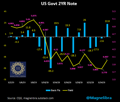 We saw this a few weeks ago when the flattening was pushed to record inversions as the US Govt 2YR hit a yield of 5.07%, to only be wiped out the other way as the US Govt 2Y yields plunged over 130 basis points, now sitting at 4.00%: