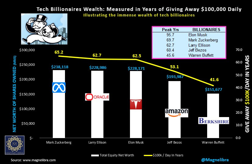 For the answer to the question in our sub headline above as to, “how many years can the tech billionaires afford to give away $100k per day?”