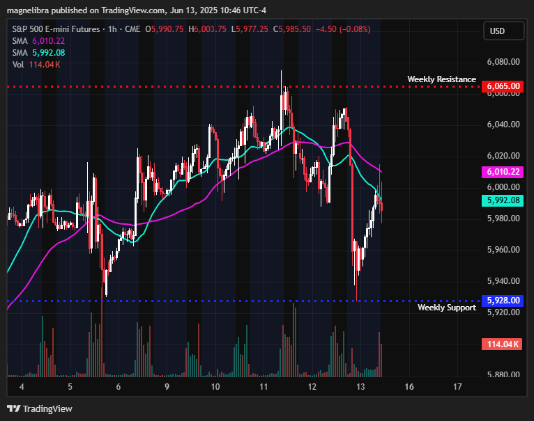 The SP500 futures hit our weekly resistance earlier this week at 6065 and retreated rather quickly then the news of the missile attack sent it reeling from 6050 right to our weeks Support level of 5928 which was almost the low right to the tick! So you can see that the weekly range for this week is well intact as both levels have been hit. We suspect better sellers most of the day as nobody will want to go home long over the weekend, but all in all the rebound already finds resistance at 6010 and we suspect that will hold most of the buyers at bay today: