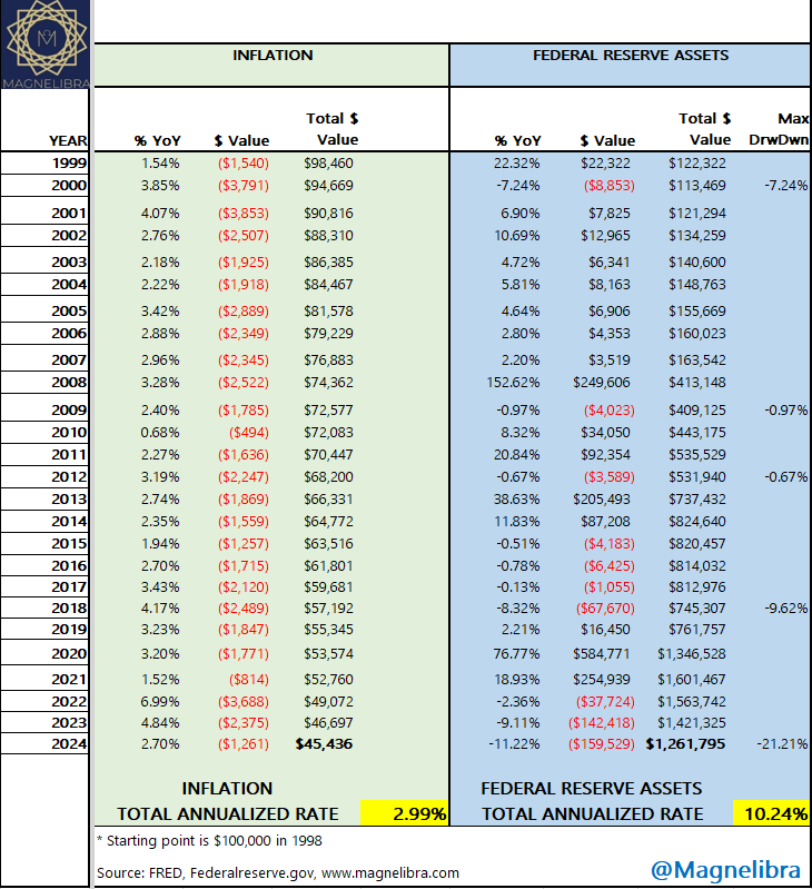 Every year it seems Magnelibra is proven correct in its ongoing thesis that the only important news driving the markets or shall we say that the “only game that matters” is how much liquidity central banks are adding or in this year’s case, SUBTRACTING and for the third year in a row its been extraction time. In regards to the US central bank, the Federal Reserve, they have cut the Fed balance sheet from a high of $9T to the present value of $6.95T. This is a 22.7% reduction, but let’s put this into context. In January of 2020 the FOMC asset base was $4.2T, so in 5 years the growth is +$2.75T or 65.5%!