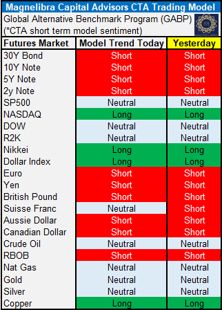 The only change to the Magnelibra CTA markets sentiment is in FX where the Suisse Franc moved from a Short to Neutral: