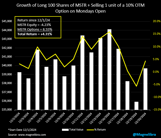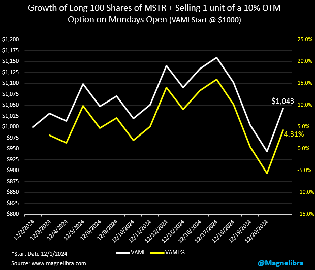Ok let’s move over to the MicroStrategy Tracker where we track the stock accompanied by a 10% OTM (out of the money weekly option). The goal here is to track this new popular vol strip mining strategy where the hope is Volatility remains elevated to offset the massive asymmetrical tail risk offered by this equity. We know MSTR is all in on Bitcoin but they are acquiring by pitching off to the equity holders a 2.3x premium. Our goal is to see if and when volatility falls, will the stock price follow suit…Interestingly enough we have seen MSTR fall from a high of $543 to trading $343 today, a whopping $200 price drop or 36.8%. Here is the data and for now this data is posting a 4.31% return for the month so far: