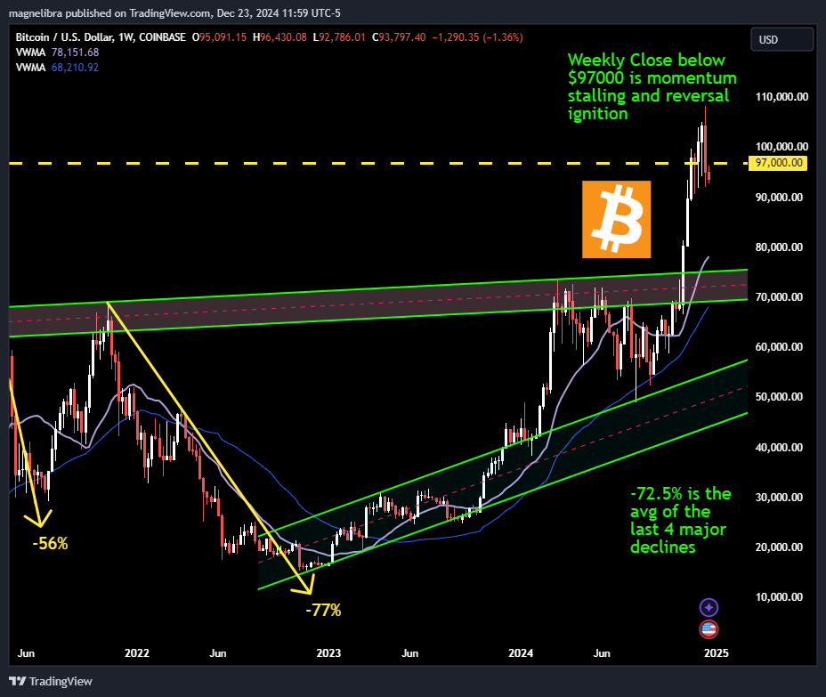 One thing is certain, nothing is certain! There are so many variables to quantify that a prudent investor must consistently reevaluate their goals, risk tolerances and then have the courage to successful enact decisions that can mitigate long term risk. A quick note to the last point, Bitcoin is presently trading under our $97k weekly reversal level, with Saylor out their trying to find new buyers for BTC, we can’t help but think the euphoria has stalled a bit, so we will watch this level closely, but for now, the sellers are clearly in control: