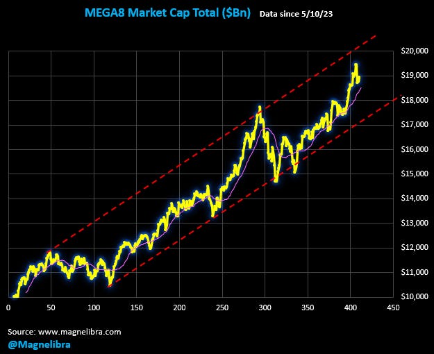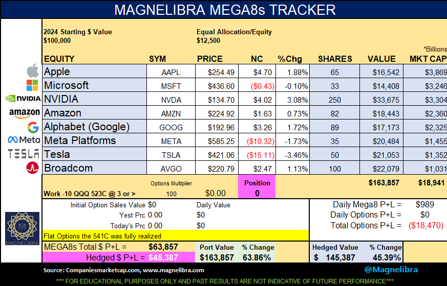 lets take a look first at the MEGA8s Tracker. For those new to our publications this is our tracker designed to follow the concentrated alpha crowd in the top mega cap equites. We have recently noticed a bit of reshuffling and we know the HF crowd buys individual high performers and sells the indexes to hedge a strategy that is very successful. Our goal with this is to try and spot the large investor exhaustion in single names and subsequent rebalancing. It is interesting to note we have seen good Nvidia selling and Apple buying, why Apple? Well I am sure we will here the why within the next few quarters…Anyway we also put forth a prospective hedge for each week to capture some volatility while giving up some upside. This is all an educational tutorial to get you to think outside the box to learn that there are ways to capture extra return than the static buy and hold methodology, which in today’s world let’s just call it for what it is, lazy…Yea maybe you don’t have the time to watch, but nothing is worth more to your time than maximizing your value of your wage.