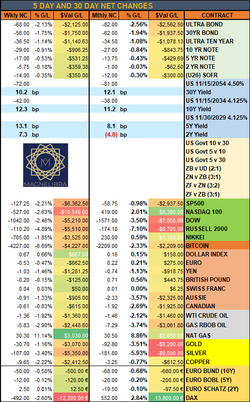 When we look at the rolling 5 and 30day trading changes, on the weekly front the Bitcoin is the big % loser dropping -6.7% on the week with Nat Gas the big % winner +11.1% and as far as the 30 day changes, Nat Gas the winner there +8.9% and the Russel2k -7.1%: