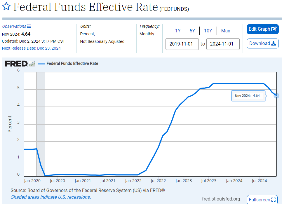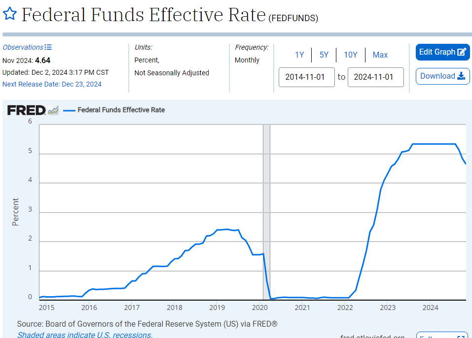Now the Regime Change has settled in and the FOMC has cut the rate down from 5.33% to the current 4.25%. This level is still high given the average rate over the last 10 years as shown in this chart:
