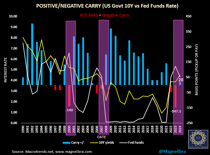 So with that said, and considering after nearly 3 years of inverted yield curves, we are embarking on the reversal of this trend. With the Dec. 18th cut and the US Govt 10Y trading at 4.53%, the FF/10Y curve spread is now positive by 20bp! What you guys should notice is the highlighted boxes from the last few times this has happened, maybe something stands out: