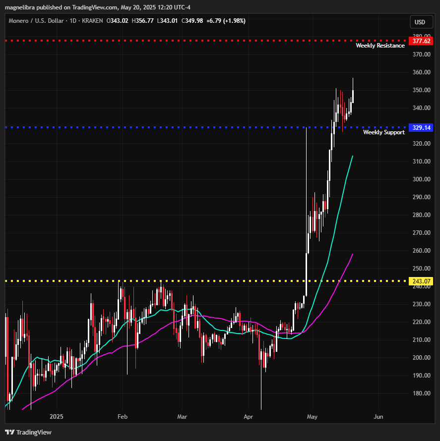 Monero flushed out levered shorts above $350 and continues to trade right there: