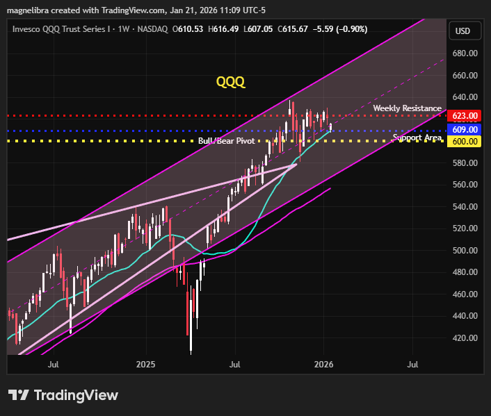 This week we suspect support initially to come at the 21pSMA at 609. Our resistance and resell point or put buying points is up at 623. Triangle wedge seems to be in place here but the QQQ is sitting smack in between our longer term trend channel: