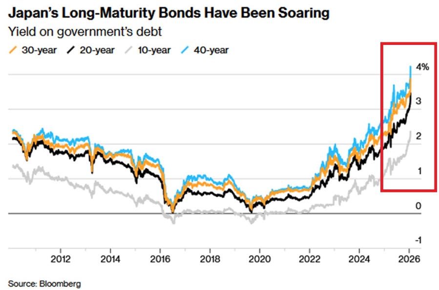 30y JGB yields near or above 3.9-4% (record highs) and 40y yields move above 4.2% (first time ever for any JGB maturity crossing 4% in over 30 years, and highest since the 40y bond’s debut in 2007).