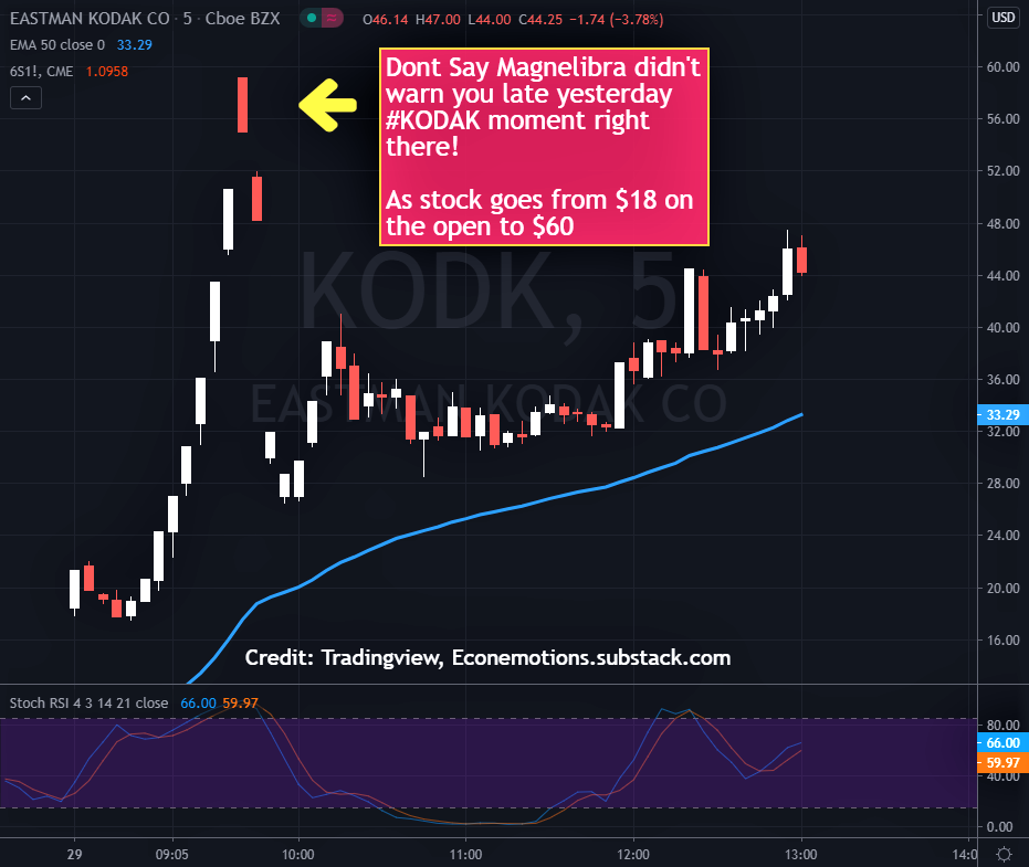 KODAK MOMENT!Magnelibra Econemotions Deserves Some Credit No?Mike AgneJul 29, 2020∙ PaidShareHey just wanted to update everyone that missed our late day post on Kodak yesterday, well maybe we just let the chart speak for itself:What an epic run, forget the FED today, KODAK is the news and wh…Continue reading this post for free, courtesy of Mike Agne.Claim my free postOr purchase a paid subscription.PreviousNext