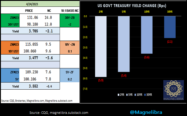 With a decent steepening bid to the market the only data that we see causing this is the continued deterioration of the banking sector as First Republic came out late in the day and it exposed the fact that its deposit base plunged 41% in the first 3 months of the year! As we told you in prior letters, when banks lose deposits, they must shed assets or utilize emergency funding like the BTFP program which was why it was created actually, so that banks do not have to realize the loses right away, they can pledge those assets to the BTFP, not for marked to market of course, but 100 cents on the dollar plus a vig…
