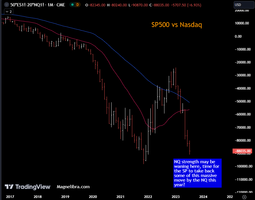 We also wanted to look at the SP500 vs Nasdaq index spread as the Nasdaq has trampled all over the SP this year, are we at a turning point?