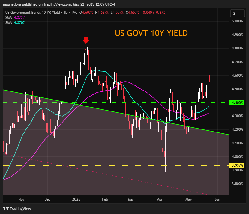 As far as the US 10Y we have now moved our pivot line up to 4.40% and a wall of resistance seems to be right here at 4.62/4.65%: