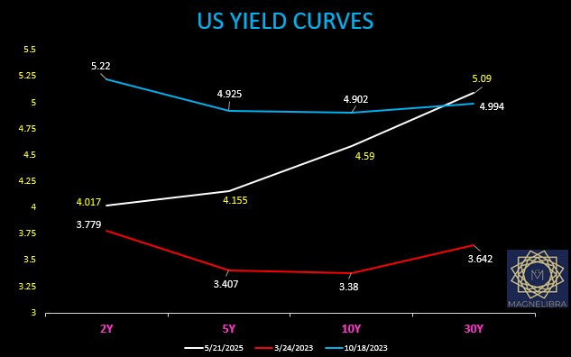 Here is the current US Govt yield curve compared to the most recent highs and yield lows. We continue to see a massive steepening occur: